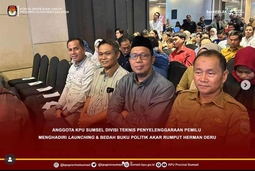 #Temanpemilih Anggota KPU Sumsel Divisi Teknis Penyelenggaraan Pemilu, Bapak Handoko menghadiri undangan launching dan bedah buku Politil Akar Rumput Herman Deru di Balroom Hotel The Alta Palembang, Senin (30/6/2025).