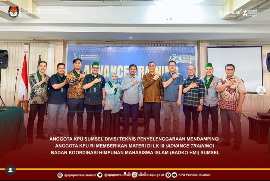 #Temanpemilih Anggota KPU Sumsel Divisi Teknis Penyelenggaraan, Bapak Handoko mendampingi Anggota KPU RI Divisi Teknis Penyelenggaraan, Bapak Idham Kholik memberikan materi "Refleksi Penyelenggaraan Pemilu-Pilkada 2024 san Upaya Menigkatkan Partisipasi Masyarakat" dalam Latihan Kader III (Advance Training) oleh Badan Koordinasi Himpunan Mahasiswa Islam (Badko HMI) Sumatera Selatan Periode 2024-2026 di Wisma Atlet Jakabaring, Sabtu (5/7/2025).