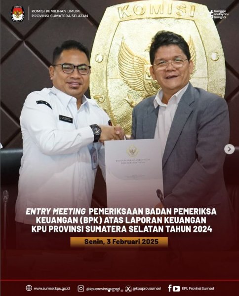 #Temanpemilih Sekretaris KPU Sumsel, Bapak Eko Iswantoro serta Jajaran Pejabat Manajerial melaksanakan Entry Meeting Pemeriksaan Badan Pemeriksa Keuangan atas Laporan Keuangan KPU Provinsi Sumatera Selatan Tahun 2024, Senin (3/1/2025).