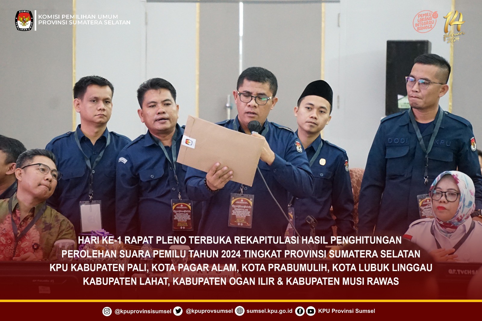 Pada hari pertama, Rabu (6/3/2024) sudah dilakukan rekapitulasi hasil penghitungan suara di tingkat kabupaten/ kota terhadap 7 (tujuh) kabupaten/ kota. Yakni Kabupaten Abab Lematang Ilir, Kota Pagar Alam, Kota Prabumulih, Kota Lubuklinggau, Kabupaten Lahat, Kabupaten Ogan Ilir dan Kabupaten Musi Rawas.