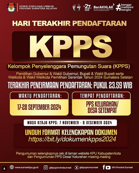 #Temanpemilih penerimaan pendaftaran KPPS terakhir hari ini sampai dengan Pukul 23.59 WIB di kantor/sekretariat PPS setempat.