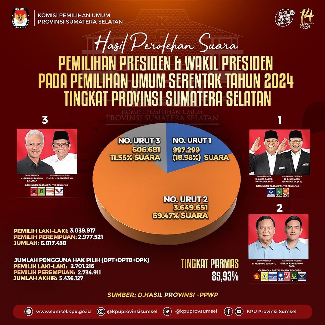 #Temanpemilih, berikut infografis hasil perolehan suara Pemilihan Presiden dan Wakil Presiden pada Pemilihan Umum Tahun 2024 di Provinsi Sumatera Selatan berdasarkan D.HASIL PROVINSI-PPWP