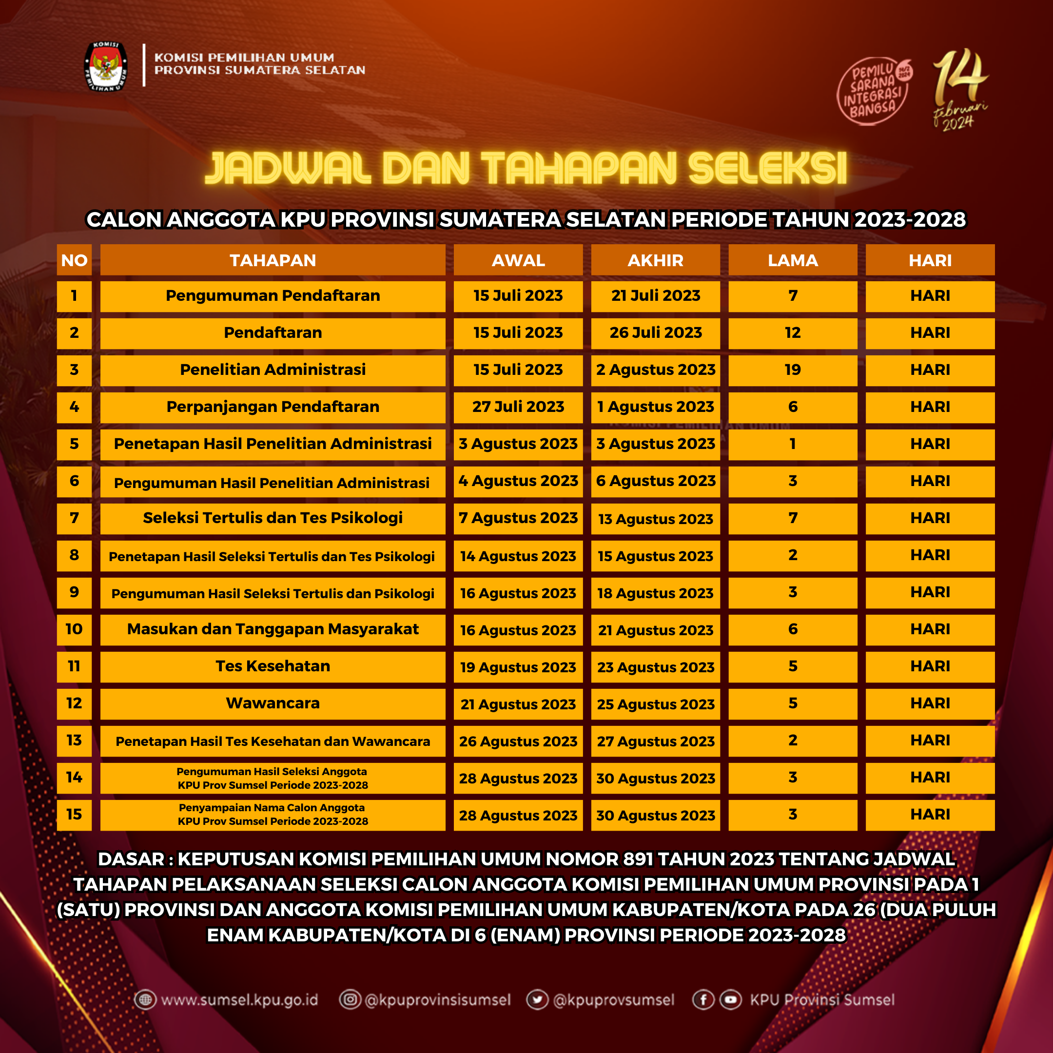 Jadwal dan Tahapan Seleksi Anggota KPU Provinsi Sumatera Selatan Periode Tahun 2023-2028 Minggu, 16 Juli 2023 16:00 4959 Keputusan Komisi Pemilihan Umum Nomor 891 Tahun 2023 tentang Jadwal Tahapan Pelaksanaan Seleksi Calon Anggota Komisi Pemilihan Umum Provinsi pada 1 (Satu) Provinsi dan Anggota Komisi Pemilihan Umum Kabupaten/Kota pada 26 (Dua Puluh Enam) Kabupaten/Kota di 6 (Enam) Provinsi Periode 2023-2028 Bagikan: Dilihat 4,959 Kali.