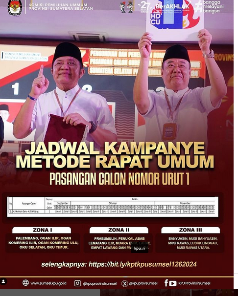 #Temanpemilih berikut jadwal kampanye pasangan calon Gubernur dan Wakil Gubernur Sumsel tahun 2024 nomor urut 1 melalui metode rapat unum berdasarkan Keputusan KPU Sumsel Nomor 126 Tahun 2024.
