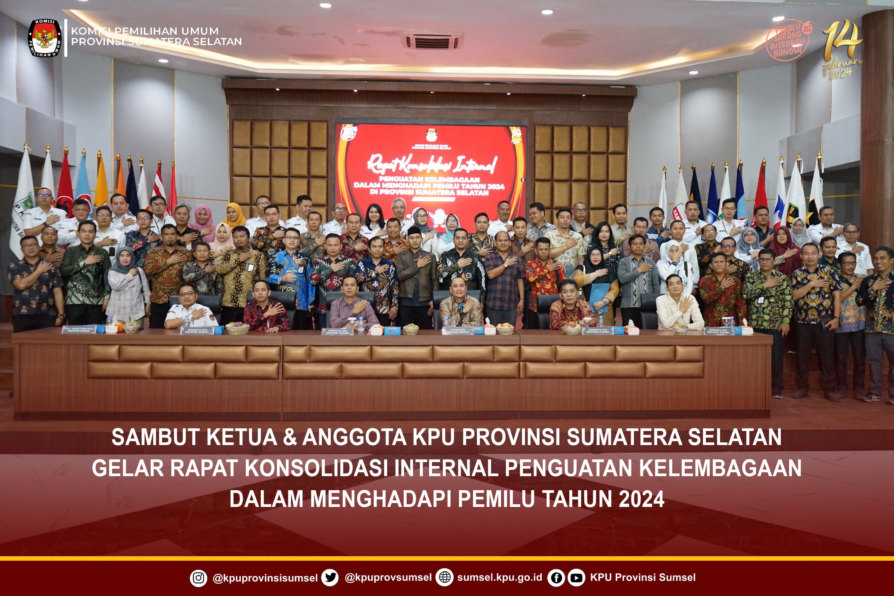 #Temanpemilih, Ketua dan Anggota KPU Provinsi Sumatera Selatan Periode Tahun 2023-2028 usai dilantik oleh Ketua KPU RI di Kantor KPU Jakarta, Rabu (15/11/2023) bertolak ke Kantor KPU Provinsi Sumatera Selatan dan disambut langsung oleh Plt. Sekretaris KPU Sumsel beserta Jajaran Sekretariat, Ketua dan Anggota KPU Kabupaten/Kota Se-Sumsel beserta Sekretaris dalam Rapat Konsolidasi Internal Penguatan Kelembagaan dalam Menghadapi Pemilu Tahun 2024 di Provinsi Sumatera Selatan, Kamis (16/11/2023).