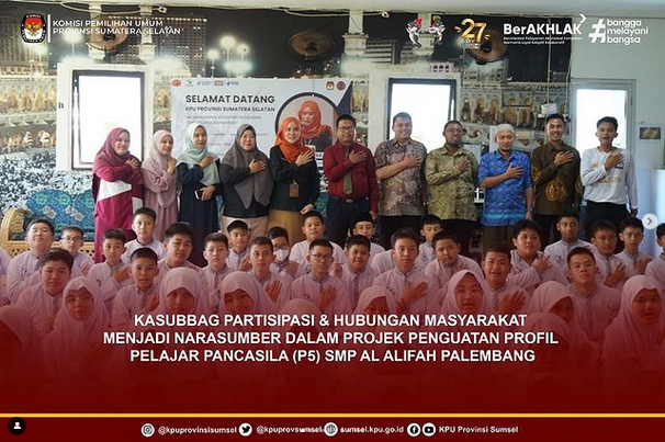 #Temanpemilih Kasubbag Partisipasi dan Hubungan Masyarakat, Ibu Herlis Miyanah menjadi narasumber dalam Projek Penguatan Profil Pelajar Pancasila (P5) di SMP Al Alifah Palembang, Rabu (9/10/2024).