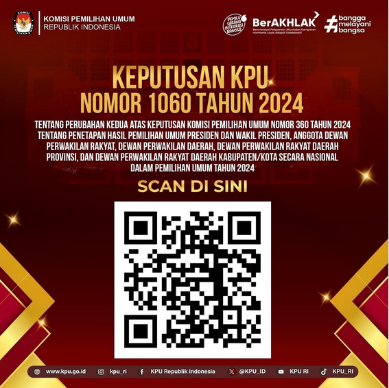 #TemanPemilih, KPU telah menetapkan Keputusan KPU Nomor 1060 Tahun 2024. Scan Barcode ini untuk menyimak Keputusannya.
