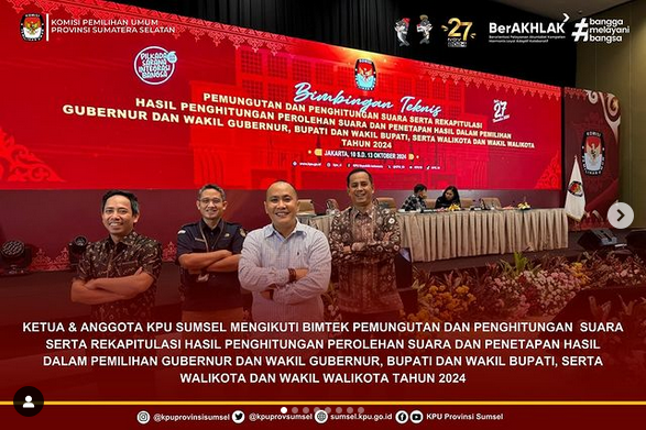 #Temanpemilih Ketua KPU Sumsel, Bapak Andika Pranata Jaya bersama Anggota Divisi Teknis Penyelenggaraan Pemilu, Bapak Handoko dan Anggota Divisi Hukum dan Pengawasan, Bapak Nurul Mubarok serta Kasubbag Teknis Penyelenggaraan, Bapak Muhammad Idrus mengikuti bimbingan teknis pemungutan dan penghitungan suara serta rekapitulasi hasil penghitungan perolehan suara dan penetapan hasil dalam Pemilihan serentak tahun 2024 yang diselenggarakan oleh KPU RI di Jakarta pada tanggal 10 sampai 13 Oktober 2024.