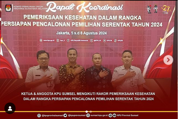 #Temanpemilih, Ketua KPU Sumsel, Bapak Andika Pranata Jaya; Anggota Divisi Teknis Penyelenggaraan Pemilu, Bapak Handoko didampingi Kasubbag Teknis Penyelenggaraan Pemili, Bapak Muhammad Idrus serta Staf Pelaksana menghadiri rapat koordinasi pemeriksaan kesehatan dalam rangka pencalonan Pemilihan serentak tahun 2024 di Jakarta, 5 sampai 8 Agustus 2024.