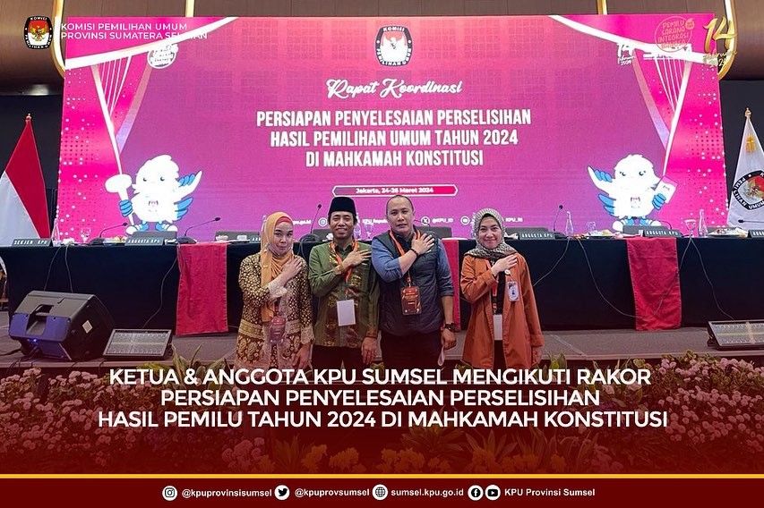 #Temanpemilih, Ketua KPU Sumsel, Bapak Andika Pranata Jaya, Anggota Divisi Hukum dan Pengawasan, Bapak Nurul Mubarok di Jakarta mengikuti rapat koordinasi persiapan penyelesaian perselisihan hasil Pemilu tahun 2024 di Mahkamah Konstitusi, 24-26 Maret 2024.