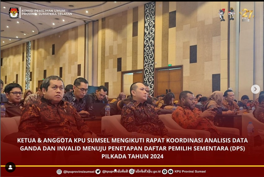 #TemanPemilih, Ketua KPU Sumsel, Bapak Andika Pranata Jaya; Anggota Divisi Perencanaan Data dan Informasi, Bapak Prahara Andri Kusuma mengikuti Rapat Koordinasi Analisa Data Ganda dan Invalid Menuju Penetapan DPS Pilkada Tahun 2024, di Yogyakarta, Sabtu (03/08/2024).
