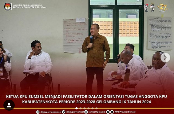 #Temanpemilih Ketua KPU Provinsi Sumatera Selatan Andika Pranata Jaya menjadi fasilitator Orientasi Tugas Anggota KPU Kabupaten/Kota Periode 2023-2028 Gelombang IX Tahun 2024, di Rindam Jaya/Jayakarta, Kamis (1/8/2024).