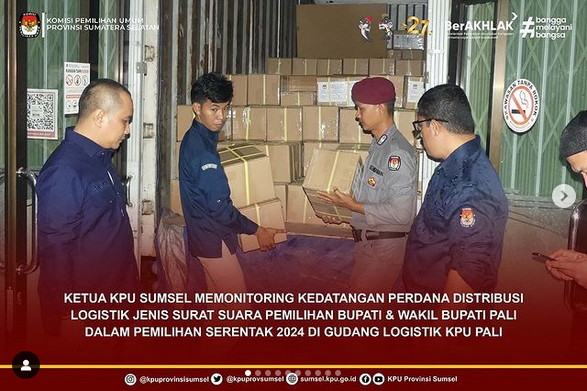 #Temanpemilih Ketua KPU Sumsel, Bapak Andika Pranata Jaya didampingi Kabag Keuangan Umum dan Logistik, Bapak Muhammad Ridho memonitoring kedatangan perdana tahapan distribusi logistik jenis surat suara di gudang logistik KPU Kabupaten Penukal Abab Lematang Ilir (PALI), Selasa (15/10/2024).