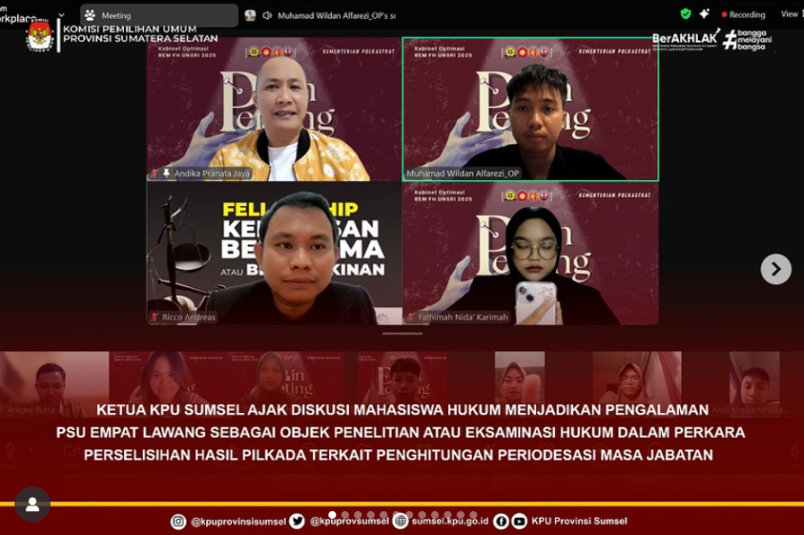 Hal itu disampaikannya dalam diskusi dan kajian hukum yang diselenggarakan oleh Kementrian Politik dan Kajian Strategis (Polkastrat) Badan Eksekutif Mahasiswa Fakultas Hukum Universitas Sriwijaya (BEM FH Unsri) Kabinet Optimasi bertajuk “Poin Penting Menjawab Tantangan Pilkada untuk Pemilu yang Demokratis” secara daring, Sabtu (14/6/2025).