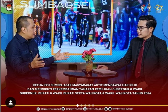 #Temanpemilih Ketua KPU Sumsel, Bapak Andika Pranata Jaya ajak Masyarakat aktif mengawal hak pilih dan memantau segala ienis informasi mengenai tahapan Pemilihan Gubenur dan Wakil Gubernur, Bupati dan Wakil Bupati serta Walikota dan Wakil Walikota tahun 2024 di seluruh media sosial dan website KPU Provinsi dan KPU Kabupaten/Kota se-Summatera Selatan. Hal itu disampaikannya dalam taping talkshow sapa sumbgsel Kompas TV Palembang, Selasa (16/7/2024.