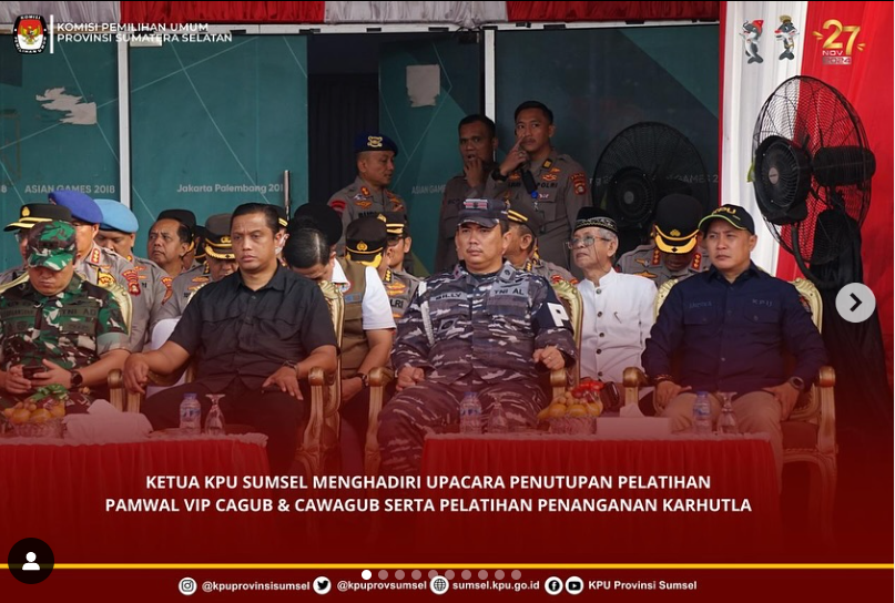 Ketua KPU Sumsel, Bapak Andika Pranata Jaya didampingi Kasubbag Parhumas menghadiri Upacara penutupan pelatihan pengamanan pengawalan VIP Calon Gubernur dan Calon Wakil Gubernur serta pelatihan penanganan Karhutla dalam Operasi Mantap Praja Musi tahun 2024 di Jakabaring Sport Center, Sabtu (27/7/2024).