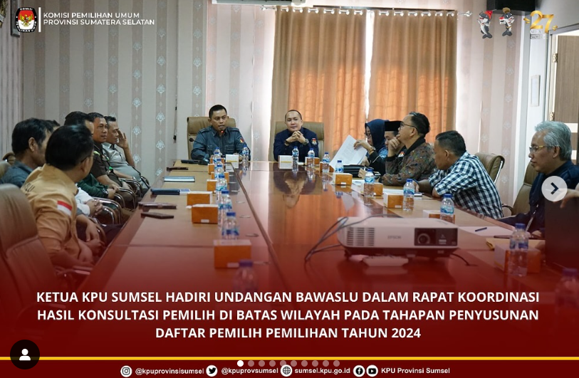 Ketua KPU Sumsel, Bapak Andika Pranata Jaya didampingi Kabag Rendatin, Bapak Ahmad Zakir; Kasubbag Datin, Bapak Rizki menghadiri undangan Bawaslu Sumsel dalam rapat koordinasi hasil konsultasi Bawaslu Sumsel terkait pemilih yang berada di wilayah perbatasan Kota Palembang dan Kabupaten Banyuasin pada tahapan penyusunan daftar pemilih pemilihan 2024, Selasa (30/7/2024). Turut hadir jajaran KPU Kota Palembang, KPU Banyuasin, Bawaslu Kota Palembang, Bawaslu Banyuasin serta Kejaksaan Tinggi Sumsel.