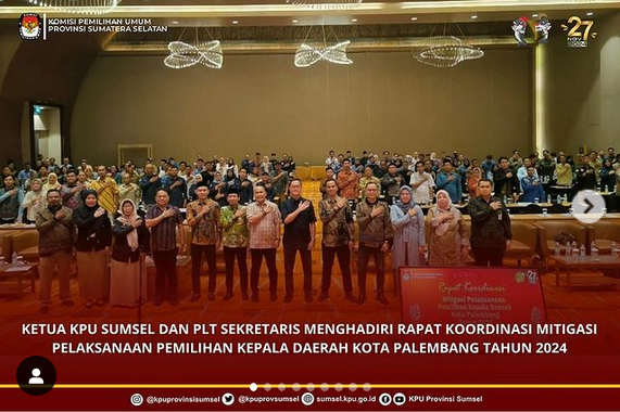 #Temanpemilih, Ketua KPU Sumsel, Bapak Andika Pranata Jaya bersama Plt. Sekretaris KPU Sumsel, Bapak Eko Iswantoro menghadiri rapat koordinasi mitigasi pelaksanaan Pemilihan Kepala Daerah yang diselenggarakan oleh KPU Kota Palembang bersama PPK dan PPS di Novotel Palembang, Minggu (11/8/2024).