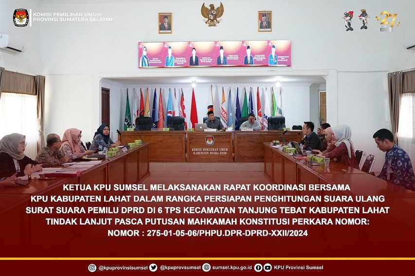 #Temanpemilih, Bertempat di ruang rapat KPU Kabupaten Muara Enim, Jum’at (7/6/2024) Ketua KPU Sumsel, Bapak Andika Pranata Jaya didampingi Kabag Hukum dan SDM, Bapak Ahmad Ferdian; Kabag Teknis Penyelenggaraan Pemilu & Parhumas, Bapak Erland Evriansyah; Kasubbag Teknis Penyelenggaraan Pemilu, Bapak Muhammad Idrus melaksanakan rapat koordinasi tindak lanjut pasca putusan Mahkamah Konstitusi terhadap PHPU Pemilu Anggota DPRD Kabupaten/ Kota Perkara Nomor: 275-01-05-06/PHPU.DPR-DPRD-XXII/2024.