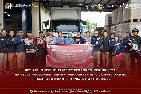 #Temanpemilih Ketua KPU Sumsel, Bapak Andika Pranata Jaya didampingi Kabag Keuangan Umum dan Logistik, Bapak Muhammad Ridho memonitoring distribusi logistik jenis surat Suara Pemilihan Gubernur dan Wakil Gubernur Sumsel, Bupati dan Wakil Bupati Kabupaten Ogan Ilir, Banyuasin dan Musi Banyuasin dari PT. Temprina Media Grafika, Sabtu (19/10/2024).