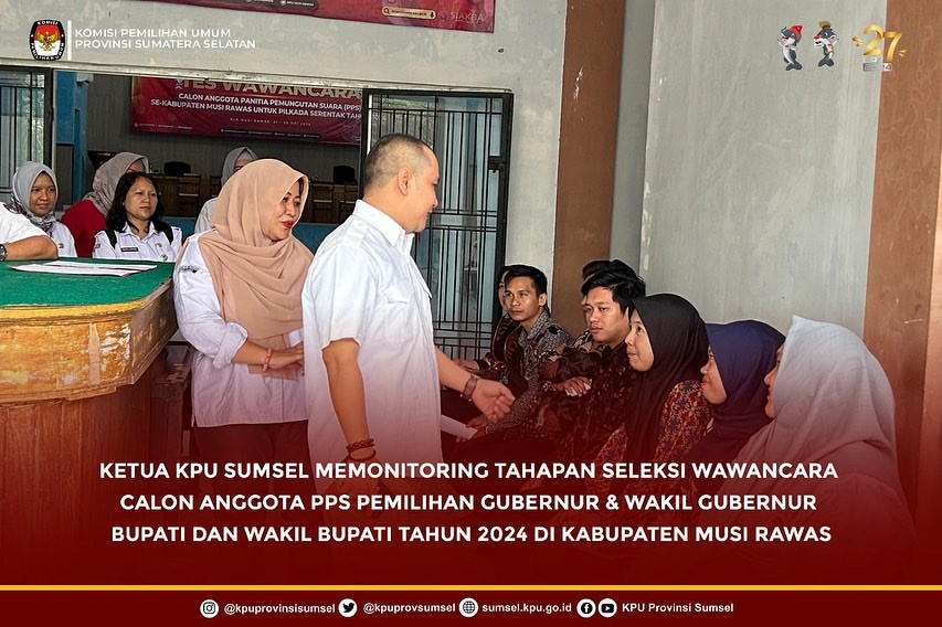 #Temanpemilih Ketua KPU Sumsel, Bapak Andika Pranata Jaya didampingi Jajaran KPU Kabupaten Musi Rawas memonitoring tahapan seleksi wawancara calon anggota Panitia Pemungutan Suara (PPS) untuk pemilihan Gubernur dan Wakil Gubernur, Bupati dan Wakil Bupati Tahun 2024 di Kabupaten Musi Rawas, Kamis (23/5/2024).