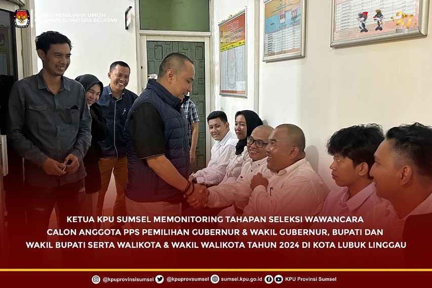 #Temanpemilih Ketua KPU Sumsel, Bapak Andika Pranata Jaya didampingi Jajaran KPU Kota Lubuk Linggau memonitoring tahapan seleksi wawancara calon anggota Panitia Pemungutan Suara (PPS) untuk pemilihan Gubernur dan Wakil Gubernur, Bupati dan Wakil Bupati Tahun 2024 di Kota Lubuk Linggau, Rabu (22/5/2024).
