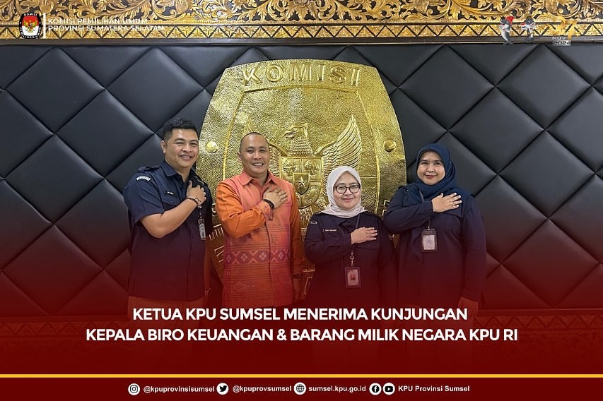 #Temanpemilih, Ketua KPU Provinsi Sumatera Selatan, Bapak Andika Pranata Jaya didampingi Kabag Keuangan Umum dan Logistik, Bapak Muhammad Ridho menerima kunjungan Kepala Biro Keuangan dan BMN KPU RI, Ibu Yayu Yuliani, Minggu (19/5/2024).