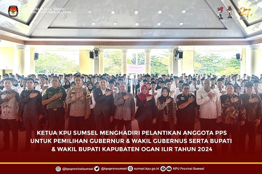 #Temanpemilih, Ketua KPU Sumsel, Bapak Andika Pranata Jaya menghadiri pelantikan PPS se-Kaabupaten Ogan Ilir dalam Pemilihan Gubernur dan Wakil Gubernur, Bupati dan Wakil Bupati Ogan Ilir Tahun 2024, Minggu (26/5/2024).