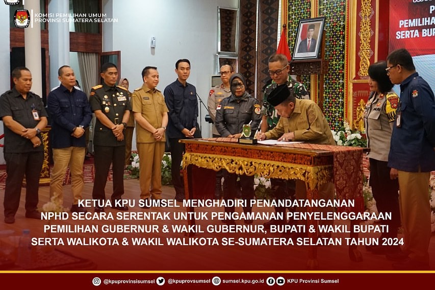 #Temanpemilih, Ketua KPU Provinsi Sumatera Selatan, Bapak Andika Pranata Jaya didampingi Plt. Sekretaris, Bapak Eko Iswantoro menghadiri penandatangan NPHD secara serentak untuk pengamanan penyelenggaraan Pemilihan Gubernur dan Wakil Gubernur, Bupati dan Wakil Bupati serta Walikota dan Wakil Walikota Sumatera Selatan tahun 2024 di Griya Agung, Selasa (7/5/2024).