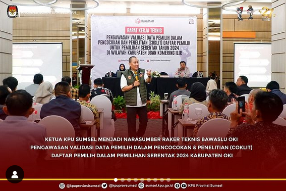 Ketua KPU Sumsel Menjadi Narasumber Raker Teknis Bawaslu OKI Pengawasan Validasi Data Pemilih Dalam Pencocokan & Penelitian (Coklit) Daftar Pemilih Dalam Pemilihan Serentak 2024 Kabupaten OKi