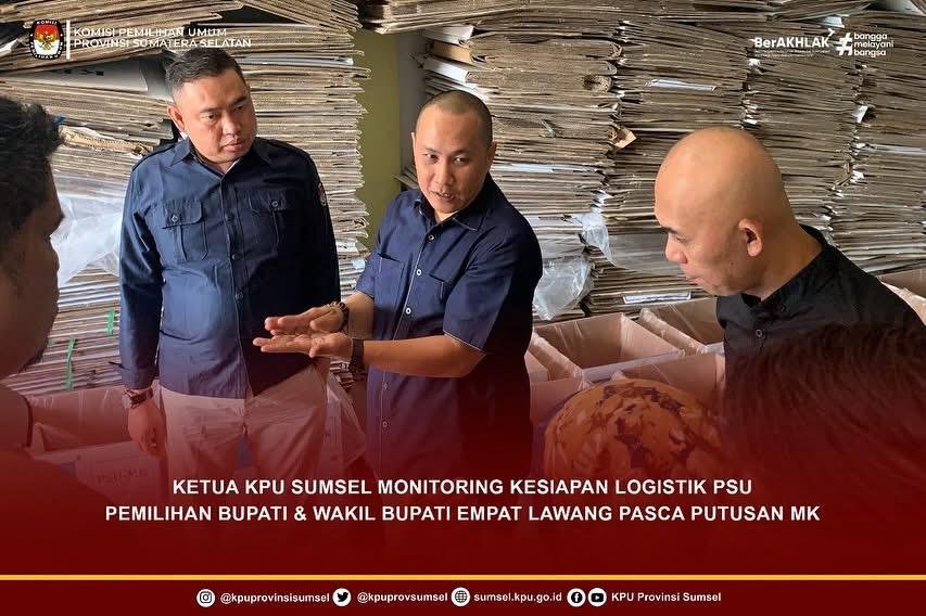 #Temanpemilih Ketua KPU Sumsel, Bapak Andika Pranata Jaya didampingi Kabag Perencanaan Data Dan Informasi, Bapak Muhammad Zakir; Kabag Keuangan Umum dan Logistik, Bapak Muhammad Ridho memonitoring kesiapan logistik Pemungutan Suara Ulang (PSU) Pemilihan Bupati dan Wakil Bupati Empat Lawang pasca putusan Mahkamah Konstitusi, Selasa (15/4/2025).