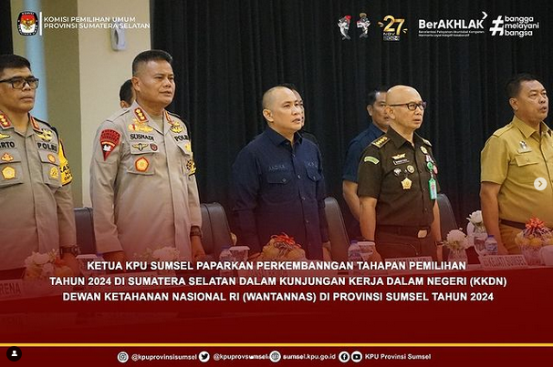 #Temanpemilih Ketua KPU Sumsel paparkan perkembangan kesiapan tahapan penyelenggaraan Pemilihan Gubernur dan Wakil Gubernur, Bupati dan Wakil Bupati serta Walikota dan Wakil Walikota Tahun 2024 dalam kunjungan kerja dalam negeri Dewan Ketahanan Nasional RI (Wantannas) di Provinsi Sumsel, Selasa (8/10/2024).