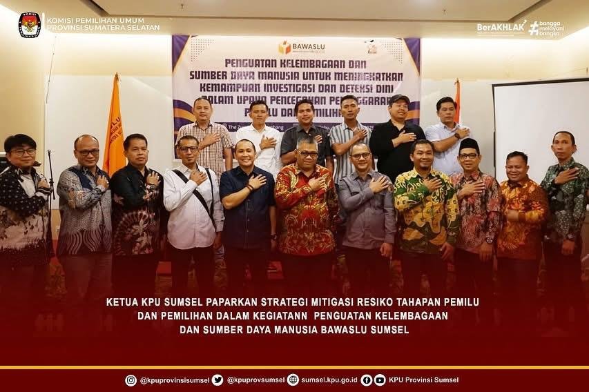 #Temanpemilih Ketua KPU Sumsel, Bapak Andika Pranata Jaya paparkan strategi mitigasi resiko tahapan Pemilu dan pemilihan dalam kegiatan penguatan kelembagaan dan sumber daya manusia yang dilaksanakan oleh Bawaslu Sumsel. Diikuti oleh Bawaslu Kabupaten/Kota se-Sumsel yang terdiri dari Ketua, Koordinator Divisi SDM, Koordinator Penanganan Pelanggaran serta Kepala Sekretariat di Hotel The Zuri Palembang, Selasa (5/8/2025).