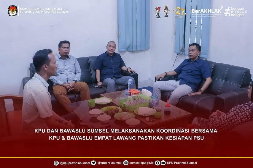 #Temanpemilih Ketua KPU Sumsel, Bapak Andika Pranata Jaya melaksanakan koordinasi bersama Bawaslu Sumsel, KPU & Bawaslu Empat Lawang untuk kesiapan Pemungutan Suara Ulang (PSU) Pemilihan Bupati dan Wakil Bupati Empat Lawang tahun 2024 pasca putusan Mahkamah Konstitusi, Selasa (15/4/2025).