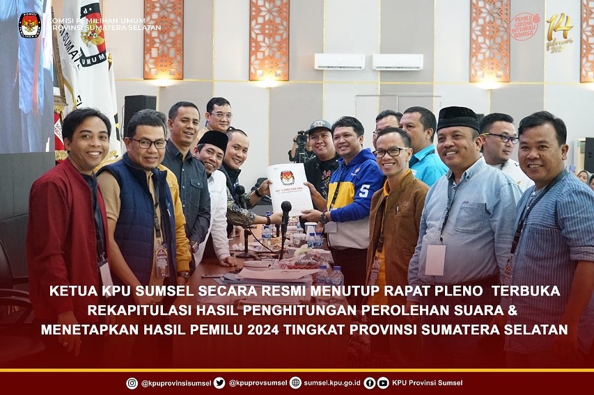 #Temanpemilih, Ketua KPU Provinsi Sumaetra Selatan secara resmi menutup Rapat Pleno Terbuka Rekapitulasi Hasil Penghitungan Perolehan Suara Tingkat Provinsi Sumatera Selatan serta menetapkan Hasil Pemilu Tahun 2024 tingkat Provinsi Sumatera Selatan Pukul 04.14 WIB, Minggu (10/3/2024).