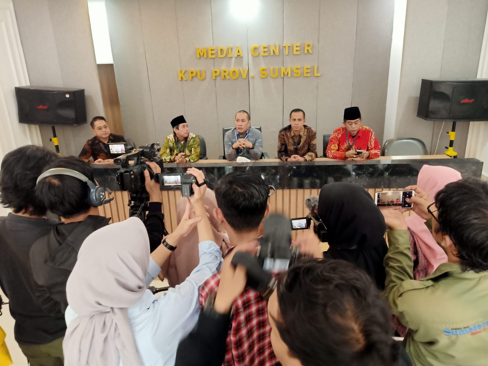 Palembang (6/03/24) – Setelah pembukaan Rapat Pleno Terbuka Rekapitulasi Hasil Penghitungan Perolehan Suara Tingkat Provinsi Sumatera Selatan serta Hasil Pemilu Serentak Tahun 2024 selesai dilaksanakan, Ketua beserta Anggota KPU Provinsi Sumatera Selatan melaksanakan konferensi pers di Media Center KPU Provinsi Sumatera Selatan.