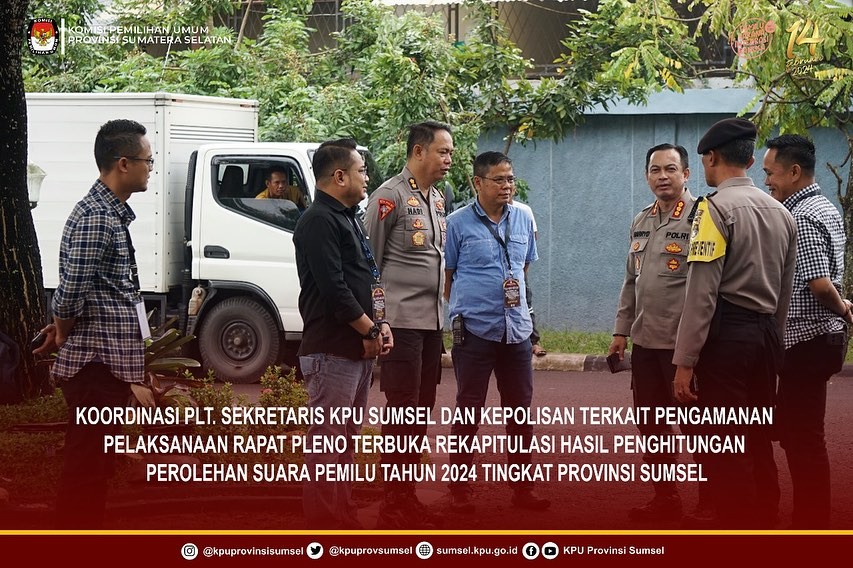 #Temanpemilih, Plt.Sekretaris KPU Sumsel, Bapak Eko Iswantoro melaksanakan koordinasi bersama Ditpamobvit Polda Sumsel terkait pengamanan dan antisipasi gangguan dalam pelaksanaan Rapat Pleno Terbuka Rekapitulasi Hasil Penghitungan Perolehan Suara dan Penetapan Hasil Pemilu Tahun 2024 tingkat Provinsi Sumatera Selatan hari ketiga, Jum’at (8/3/2024).