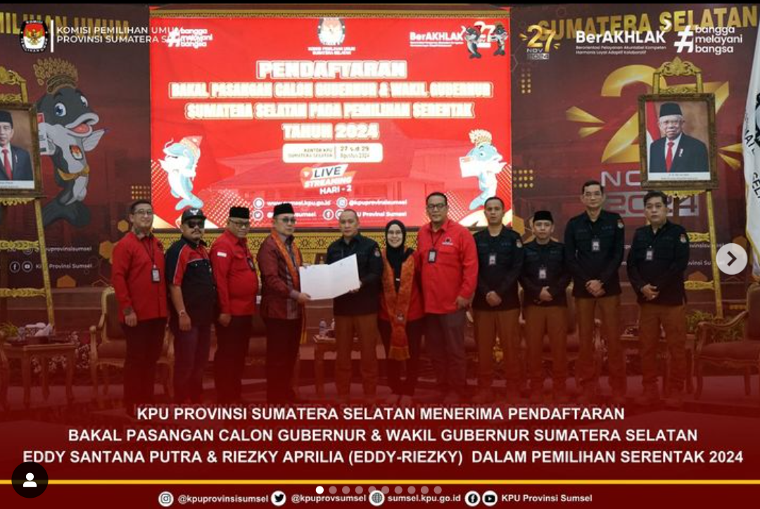 Palembang (28/08/24) – KPU Provinsi Sumatera Selatan menerima pendaftaran bakal pasangan calon Gubernur dan Wakil Gubernur Sumatera Selatan Bapak Eddy Santana Putra dan Ibu Riezky Aprilia (Eddy-Riezky) yang diusung oleh Partai Demokrasi Indonesia Perjuangan (PDIP). Bakal pasangan calon tersebut hadir di kantor KPU Provinsi Sumatera Selatan pada pukul 15.54 wib.