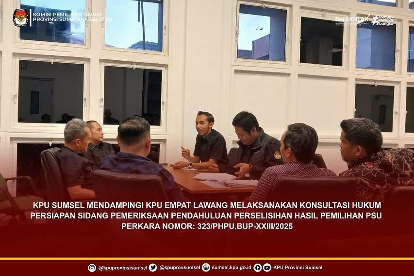 Temanpemilih Ketua KPU Sumsel, Bapak Andika Pranata Jaya; Kordiv Hukum dan Pengawasan, Bapak Nurul Mubarok serta Kordiv Sosdiklih Parmas dan SDM, Bapak Prahara Andri Kusuma dan Kordiv Teknis Penyelenggaraan Pemilu, Bapak Handoko mendampingi Jajaran KPU Kabupaten Empat Lawang melaksanakan konsultasi hukum dalam rangka persiapan sidang pemeriksaan pendahuluan dalam agenda mendengar permohonan pemohon atas perkara nomor: 323/PHPU.BUP-XXIII/2025 yang diajukan oleh pasangan calon nomor urut satu, Budi Antoni Aljufri dan Henny Verawati.