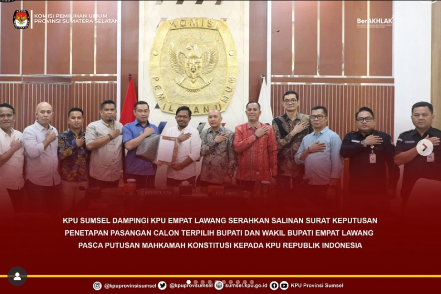 KPU SUMSEL Dampingi KPU Empat Lawang Serahkan Salinan SK Penetapan Pasangan Calon Bupati dan Wakil Bupati