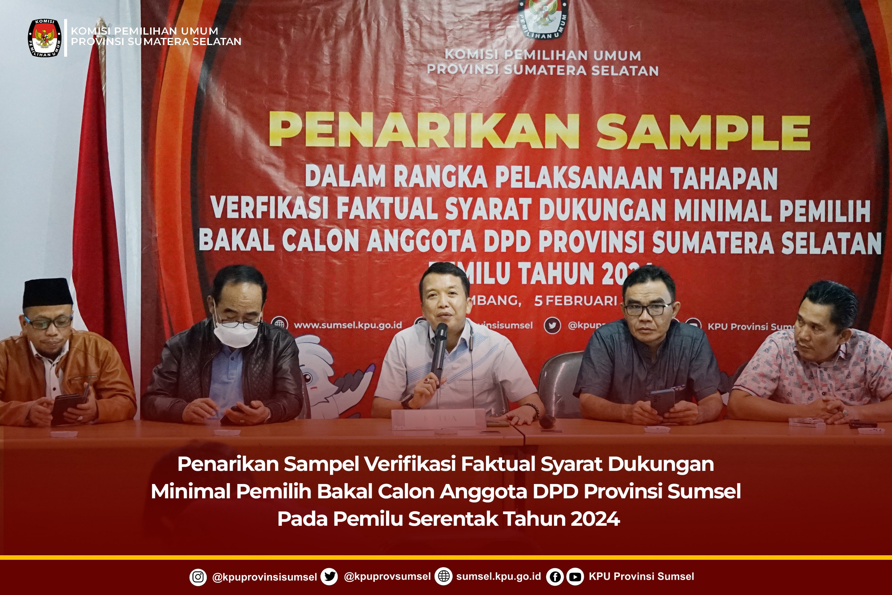 Anggota KPU Sumsel Divisi Teknis Penyelengaraan Pemilu, Hendri Daya Putra menjelaskan bahwa proses penarikan sampel dilakukan melalui aplikasi Silon. "yakni KPU Provinsi Sumsel menentukan populasi, kemudian dilanjutkan dengan pengambilan nomor awal sampel oleh masing-masing Bakal Calon dan dilanjutkan dengan pecuplikan sampel oleh KPU Sumsel melalui Silon menggunakan metode Krejcie dan Morgan serta metode pengambilan sampel sistematis", Ujarnya.