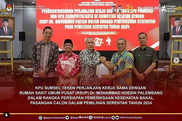 Penandatanganan Perjanjian Kerja Sama tersebut juga dilangsungkan oleh 17 Kabupaten/Kota se-Sumsel dengan RSUP Dr. Mohammad Hoesin Palembang sebagai tempat pelaksanaan pemeriksaan kesehatan bakal pasangan calon Bupati dan Wakil Bupati serta Walikota dan Wakil Walikota tahun 2024.
