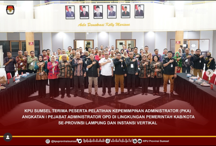#Temanpemilih Bertempat di Aula Demokrasi Kelly Mariana, Rabu (9/7/2025) KPU Provinsi Sumatera Selatan terima kunjungan 41 orang pejabat administrator dari organisasi perangkat daerah di lingkungan Pemerintah Kabupaten/ Kota se-Provinsi Lampung dan instansi vertikal dalam pelatihan kepemimpinan administrator (PKA) angkatan satu.