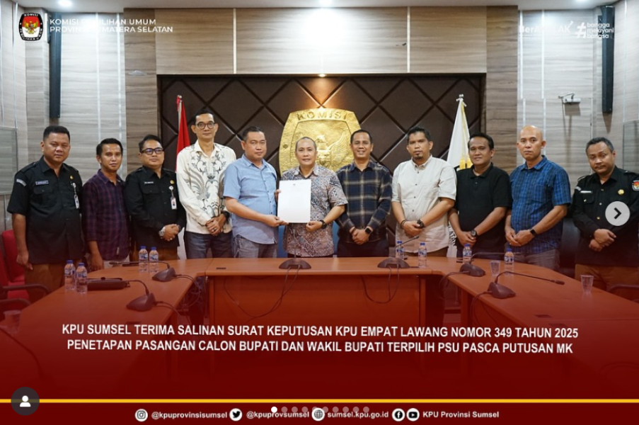#Temanpemilih KPU Sumsel terima salinan Surat Keputusan KPU Kabupaten Empat Lawang Nomor 349 tahun 2025 tentang penetapan pasangan calon Bupati dan Wakil Bupati terpilih dalam pemungutan suara ulang pasca putusan Mahkamah Konstitusi, Rabu (4/6/2025).