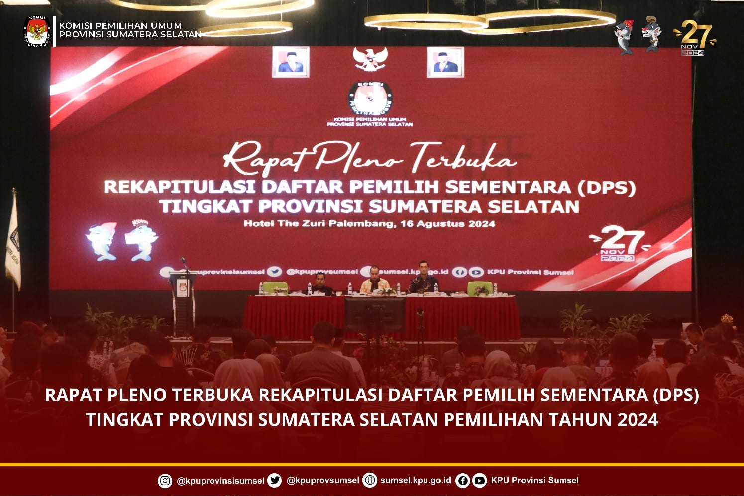 DPS tersebut ditetapkan dalam rapat pleno terbuka rekapitulasi Daftar Pemilih Sementara (DPS) Tingkat Provinsi Sumatera Selatan dalam Pemilihan Tahun 2024 yang dituangkan dalam Berita Acara Nomor: 325/PL.02.1-BA/16/2024 di Hotel The Zuri palembang, Jum’at (16/8/2024).