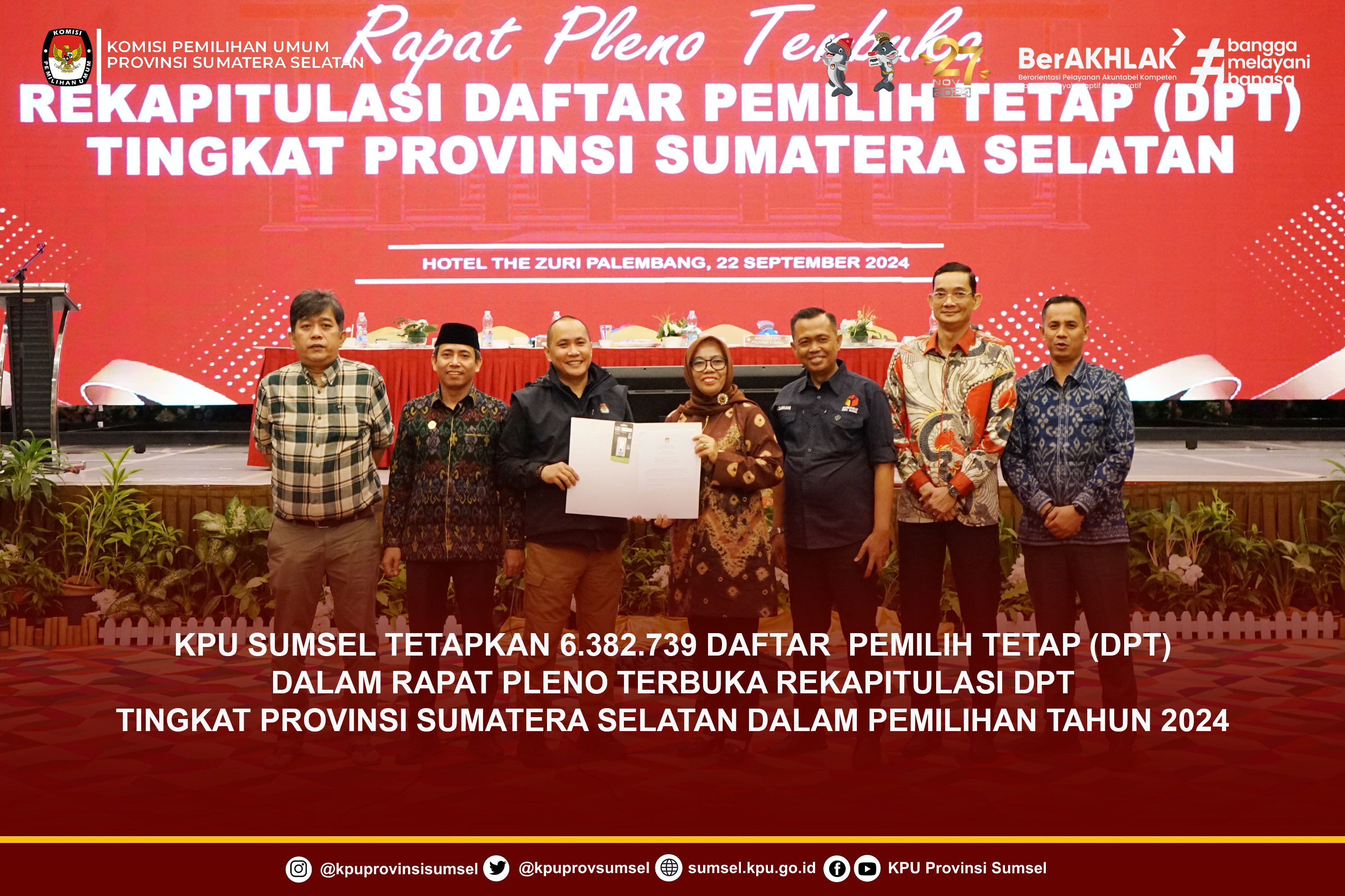 #Temanpemilih KPU Provinsi Sumatera Selatan menetapkan 6.382.739 Daftar Pemilih Tetap (DPT) yang terdiri dari 3.219.840 Pemilih Laki-Laki dan 3.162.899 Pemilih Perempuan yang tersebar di 13.206 TPS, 17 Kab/Kota, 241 Kecamatan pada 3.249 Desa/ Keluarahan. DPT tersebut dituangkan dalam Berita Acara Nomor:384/PL.02.1-BA/16/2024 dalam rapat pleno terbuka rekapitulasi Daftar Pemilih Tetap tingkat Provinsi Sumatera Selatan dalam Pemilihan 2024 bersama KPU Kabupaten/Kota, Bawaslu Sumsel, Forkopimda, Kepolisian Daerah dan stakeholder terkait di Hotel The Zuri Palembang, Minggu (22/9/2024).