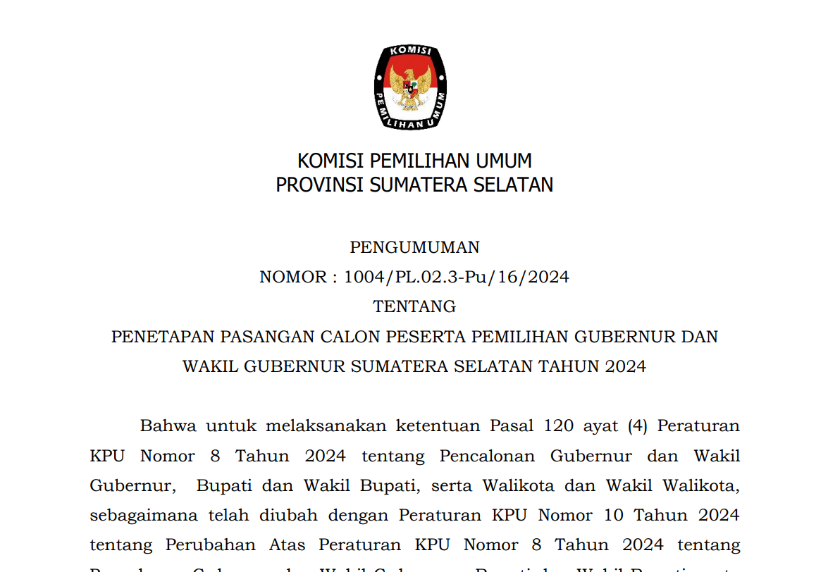 3#Temanpemilih KPU Sumsel telah melaksanakan rapat pleno penetapan penetapan pasangan calon Gubernur dan Wakil Gubernur Sumatera Selatan tahun 2024 yang dituangkan dalam Keputusan KPU Sumsel Nomor 119 Tahun 2024.