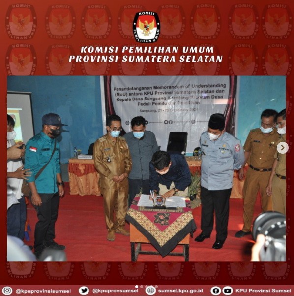 Sungsang, 21 September 2021, Ketua dan Anggota KPU Provinsi Sumatera Selatan beserta Sekretaris melaksanakan Penandatanganan Memorandum of Understanding (MoU) dengan Kepala Desa Sungsang II tentang locus Program Desa Peduli Pemilu dan Pemilihan. Penandatanganan MoU tersebut dihadiri langsung oleh Bupati Banyuasin, Asisten I, dan Camat Banyuasin II serta tokoh masyarakat yang menjadi kader dalam Program Desa Peduli Pemilu dan Pemilihan.