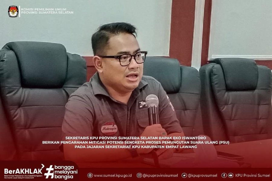 Temanpemilih Sekretaris KPU Sumsel, Bapak Eko Iswantoro memberi arahan mitigasi potensi sengketa proses pemilihan kepada jajaran sekretariat KPU Kabupaten Empat Lawang Satu hari menjelang hari pemungutan suara ulang (PSU) Pemilihan Bupati dan Wakil Bupati pasca putusan Mahkamah Konstitusi, Jum'at (18/4/2025).