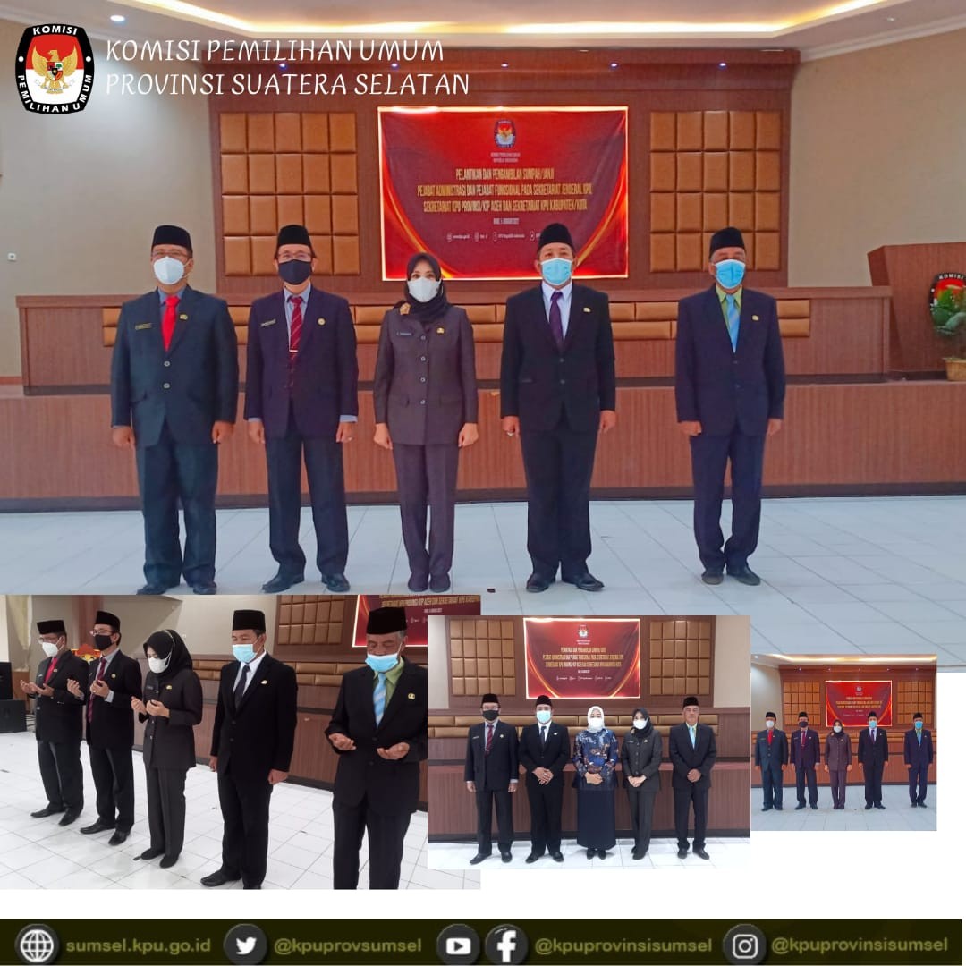 #TemanPemilih,Hari ini dilaksanakannya Pelantikan dan pengambilan sumpah/janji Pejabat Administrasi dan Pejabat Fungsional di lingkungan Sekretariat KPU Provinsi/KIP Aceh dan Sekretariat KPU Kab/Kota dilaksanakan secara daring pada hari Kamis tanggal 5 Januari 2022. Pejabat administrasi yang dilantik di lingkungan Sekretariat KPU Provinsi Sumatera Selatan yaitu Abdullah, SH., MA sebagai Kabag Hukum dan SDM; Akhmad Zakir, S.Sos.,M.AP sebagai Kabag Perencanaan, Program dan Data; Hj. Ferlyna Threesia, S.Pd., M.Si sebagai Kabag Keuangan, Umum dan Logistik; serta Erlan Evriansyah, SH., MH sebagai Kabag Teknis Penyelenggaraan Pemilu, Partisipasi dan Hubungan Masyarakat. Dalam kesempatan ini juga KPU RI melantik Irto Sunardi, SE., M.Si sebagai Sekretaris KPU Kabupaten OKU Timur.